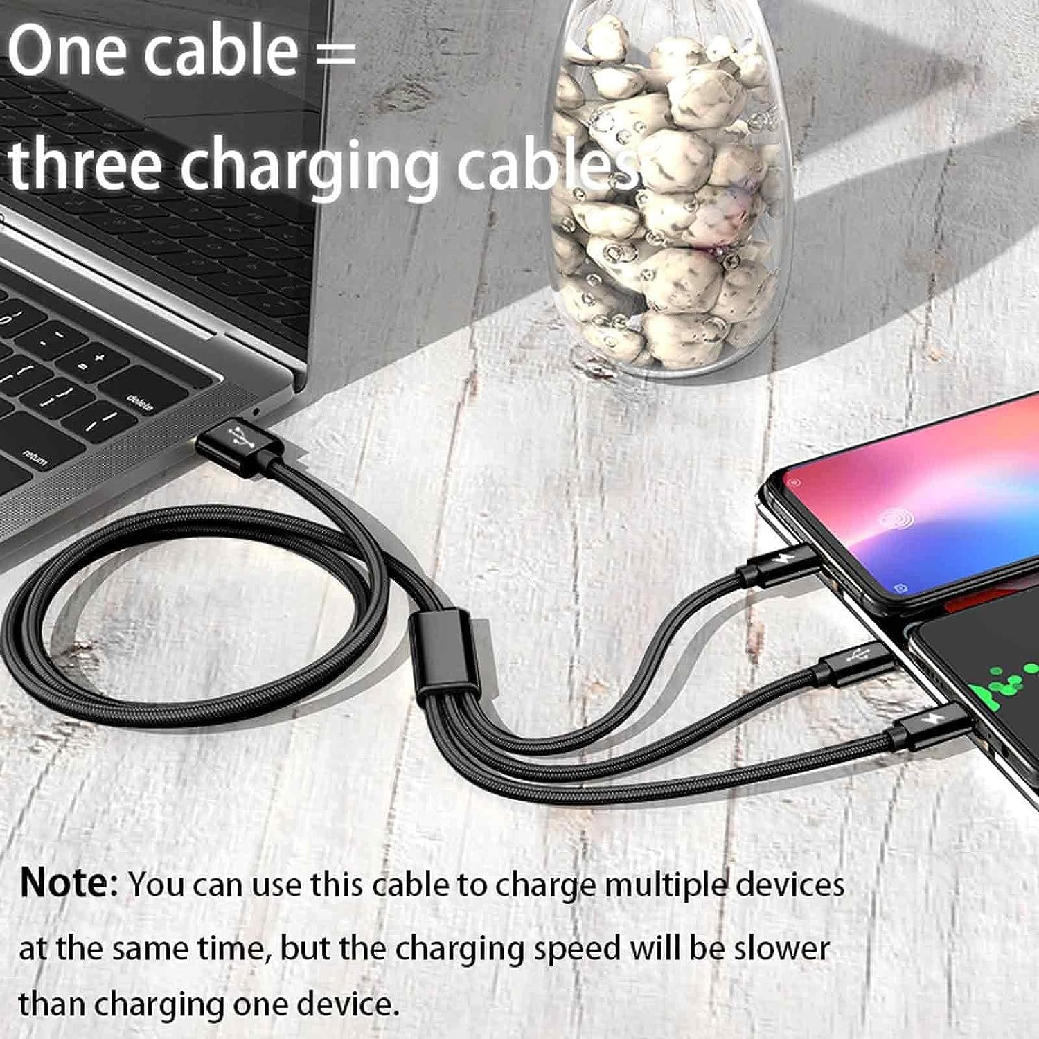 • Multi-functional 3 in 1 charging cable with built-in all three cables like Type C, and Micro USB connectors and compatible for iphone, allowing compatibility with every phones. Charge multiple devices simultaneously with just one cable.