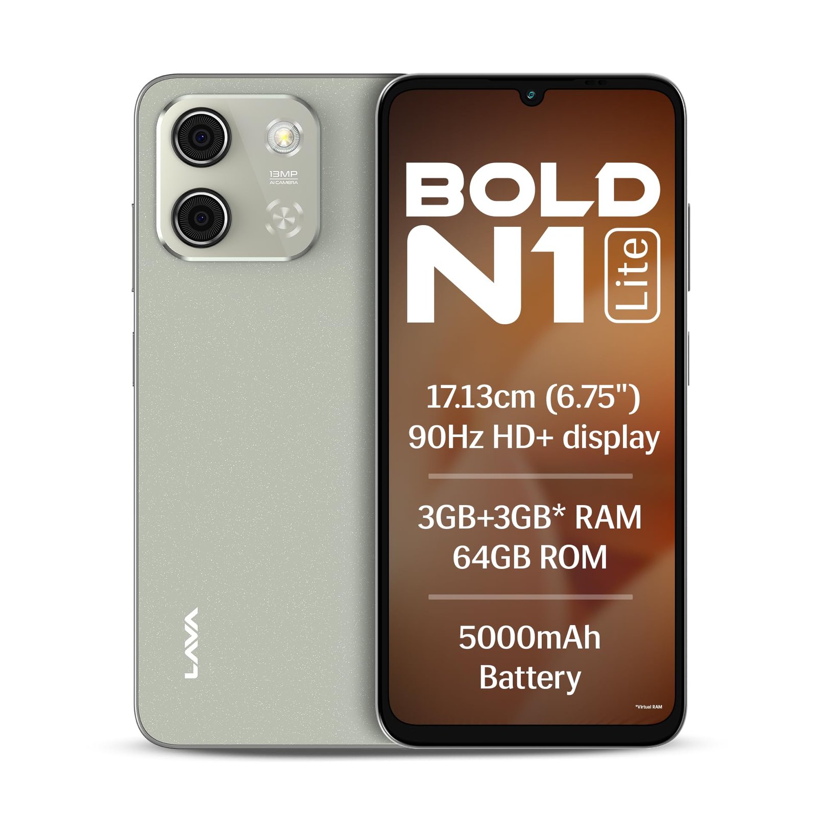 Details: Lava Bold N1 Lite is built for everyday brilliance. Stream shows on its immersive 6.75″ HD+ display, capture memories with the 13MP AI camera, and multitask smoothly with expandable RAM. The 5000mAh battery with Type-C charging keeps you powered through work, play, and travel, while fingerprint and face unlock safeguard your data. A perfect blend of style, performance, and reliability for your daily digital life.