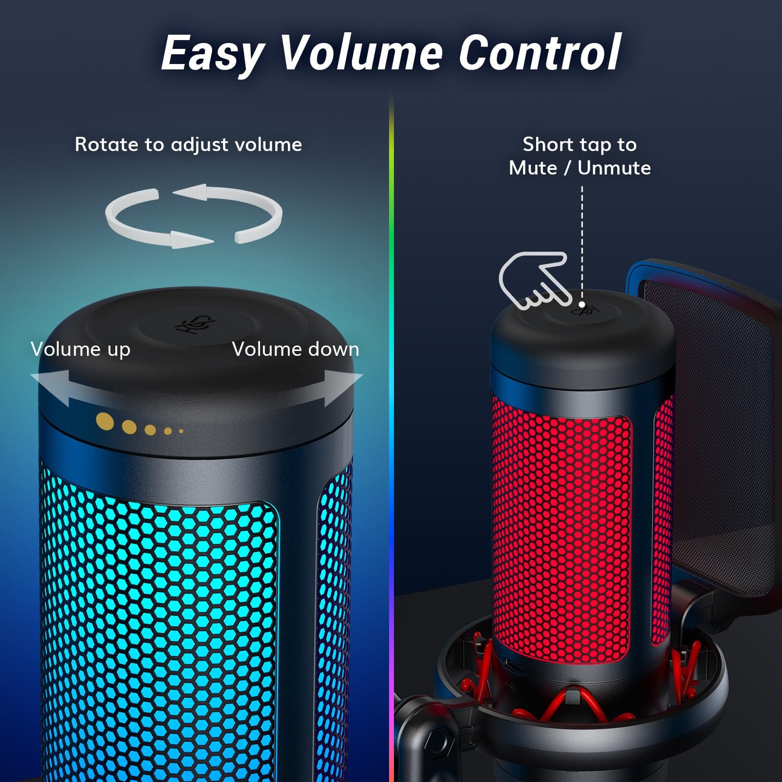 - Convenient Sound Control: Easily mute it by tapping the top of the microphone, allowing you to turn off the microphone’s sound during live streaming or gaming. Rotating the top of the microphone makes it easy to adjust the microphone’s gain, ensuring that you maintain an appropriate volume at all times. All of these operations are simple and convenient, and can be completed in an instant, giving you complete control.